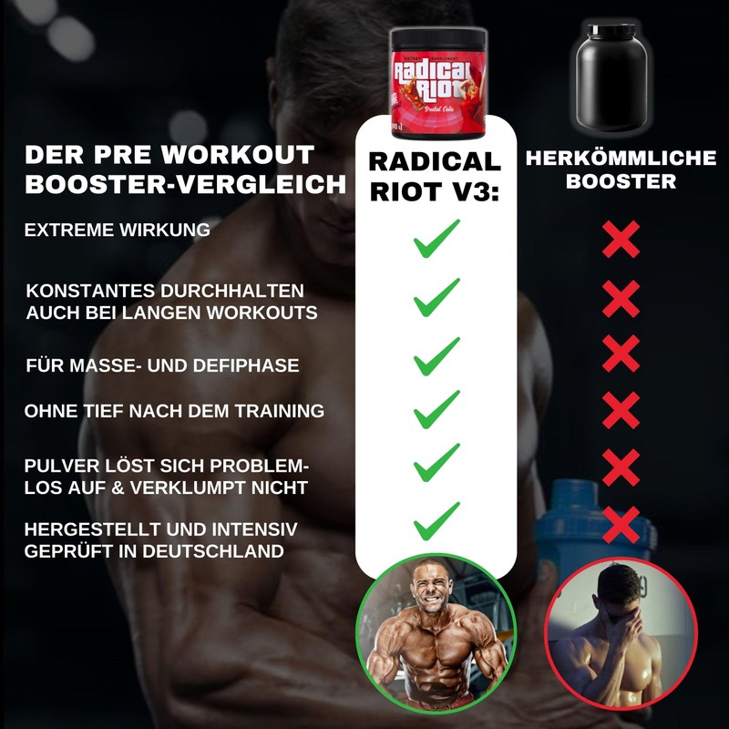 - ? - Unser Radical Riot Preworkout Booster ist die perfekte Erg?nzung fr intensive Einheiten im Gym. Mit ausgew?hlten Inhaltsstoffen entwickelt, um ambitionierte Athleten bei harten Workouts bestm?glich zu untersttzen.