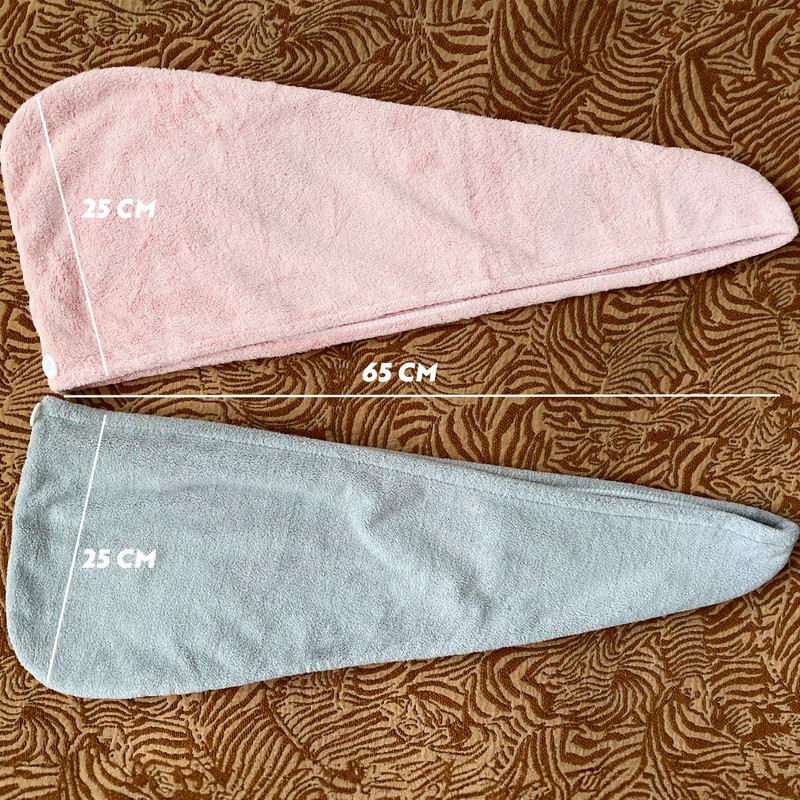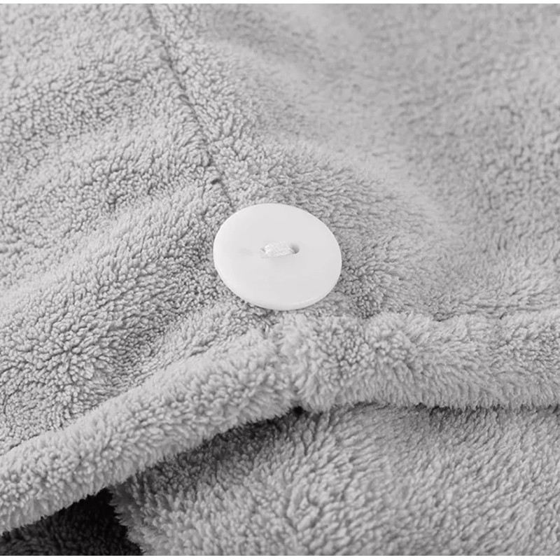 Unique cap design with button to keep the towel wrapped around all head shapes and hairstyles.
