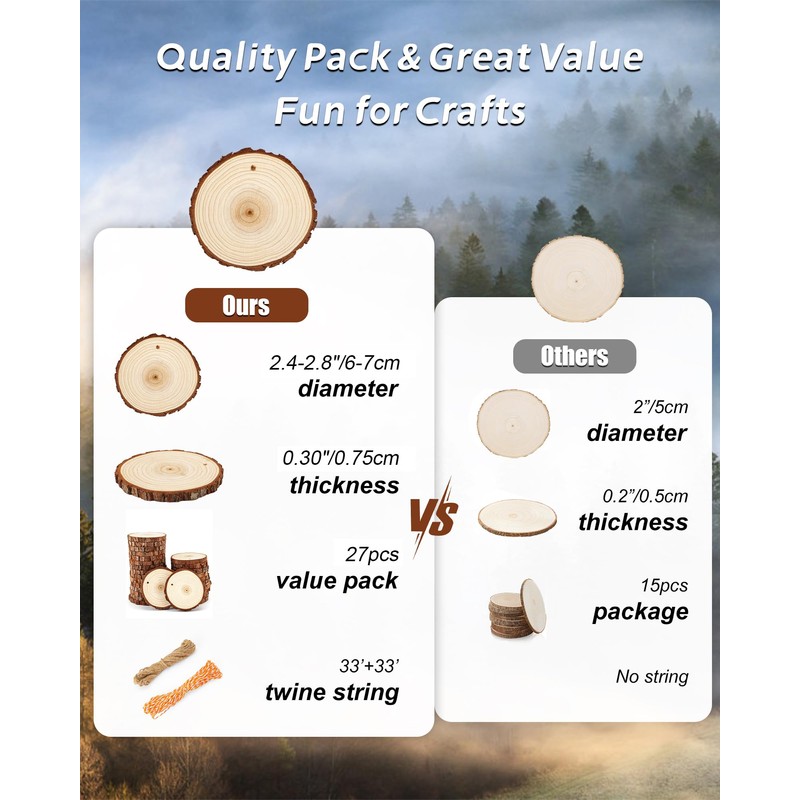 - Great Value Pack natural wood slices: 27 PCs x tree cookies bulk craft (dia: 2.4-2.8". thick: 0.30"), 1 x 33ft jute rope, 1 x 33ft orange-and-white intersecting rope. Shrink wrap packaging avoids tree barks from coming off en route.