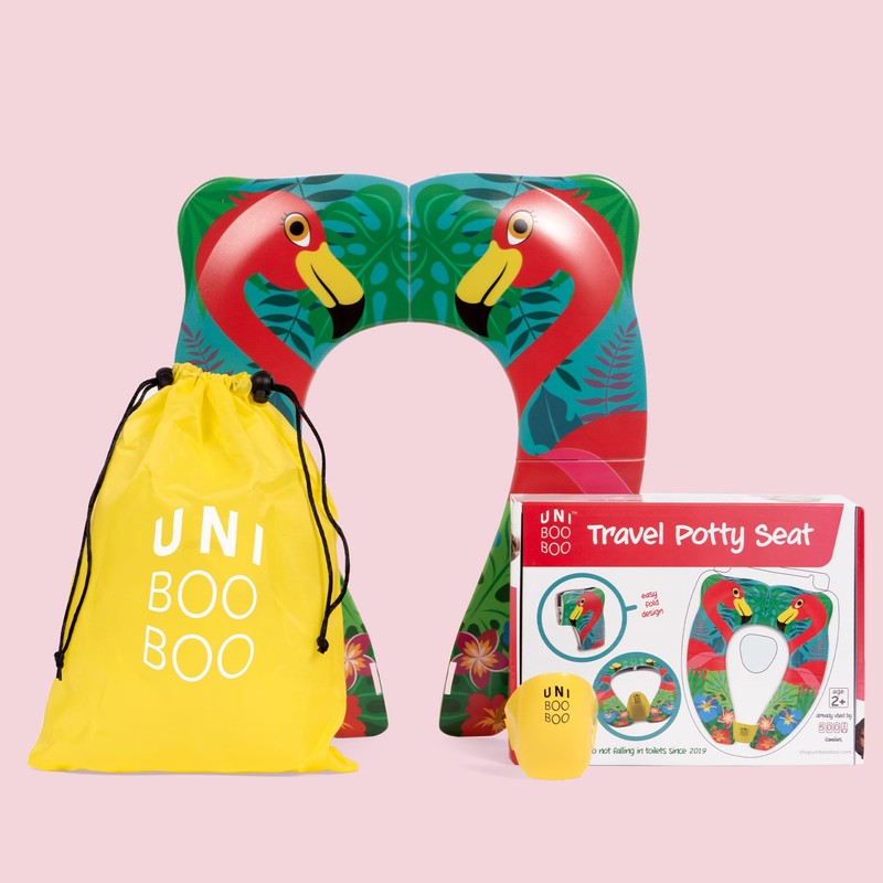 UNI BOO BOO Travel Potty Seat - Portable and Foldable Toddler Kids Toilet Training Seat for All Toilets - with Splash Guard and Rubber Pads - Free Kids Travel Bag for Boys and Girls (Flamingo)