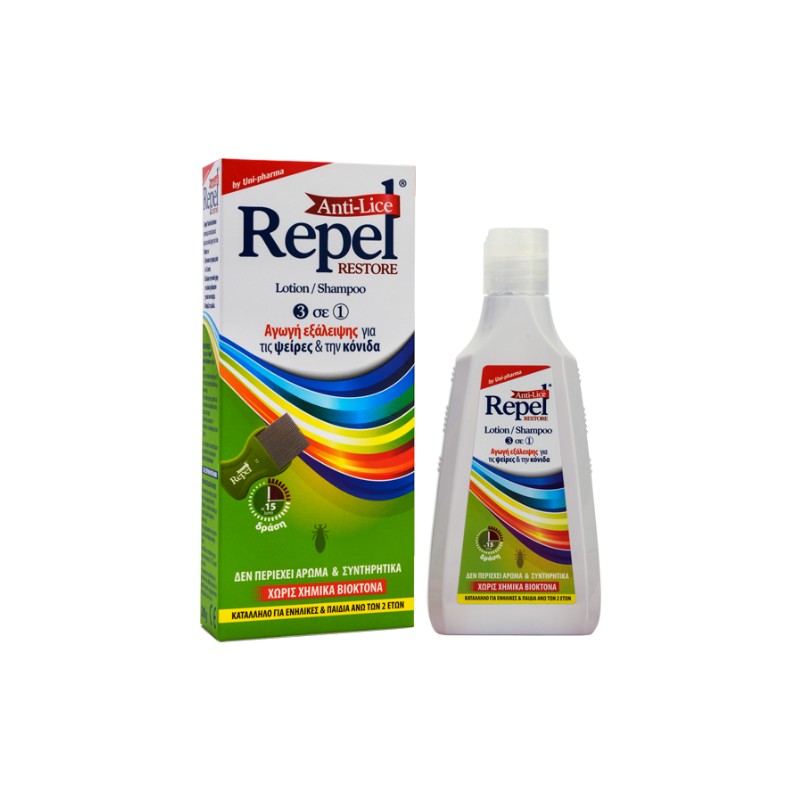Unipharma Repel Anti-Lice Restore shampoo comprises of a Lotion - Shampoo ανδ a specially designed comb and effectively relieves the scalp of lice and nits. It should be applied on hair, only after a confirmed infestation of lice.