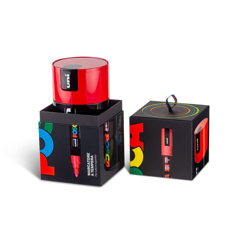 UNI POSCA GIFT BOX, 18 Markers in Assorted Colours - Medium Round Tip - Line Width 2.5 mm - Aluminium Gift Box, Colour of Lid: Red