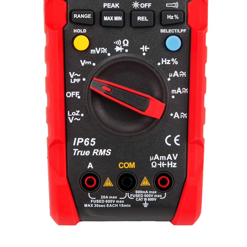 - True RMS. Measures AC DC voltage (600 V max), LoZ ACV (V), ACV LPF, AC DC current (20A max), resistance, capacitance, frequency, duty cycle. Diode test, continuity. Data hold. Max/Min. Worklight and auto backlight