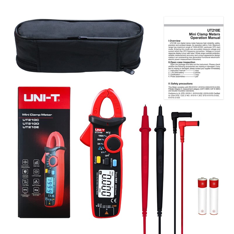 - UNI-T value pack includes: 1 x UT210E clamp meter, 1 pair of test leads, 2 AAA batteries, 1 x paper manual (En), 1 x eManual (En), 1 x zip bag/black, 1 gift box.