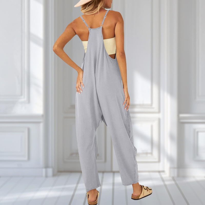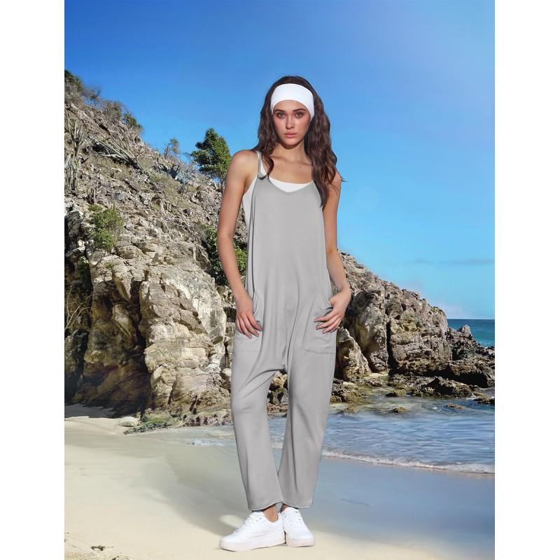 - FEATURES: Adjustable one piece jumpsuits for women.Deep v neck; Comfy & Baggy overalls; Wide leg long harem pant rompers for women; Loose fit design; Two big side pockets; Low crotch; Solid color; Lounge sleeveless jumpsuit with adjustable spaghetti strap