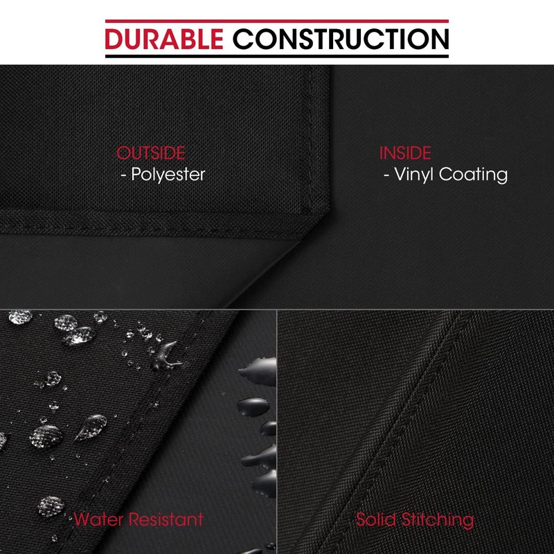 - Upgraded Material- New special fade resistant fabric with vinyl coating, water repellent processed, the new material exhibits superior colorfastness, resists UV, repels rain, resists tears and cold cracking, durable and long-lasting, gives your grill all year round protection against sun, rain, snow, hail, wind, dust, dirt and etc.