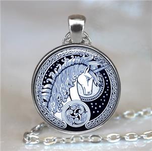 Unicorn Celtic Art Pendant Necklace With Chain Black With Silvertone Chain