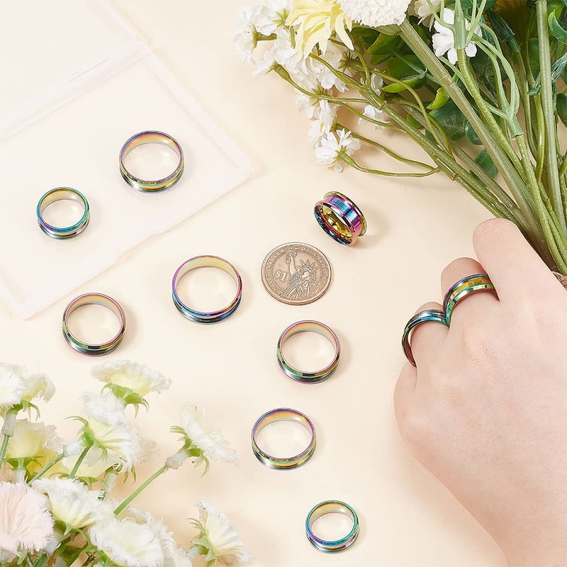 UNICRAFTALE 14pcs Rainbow Blank Core Ring Size 6-12 Stainless Steel Grooved Ring with Velvet Pouches Round Empty Ring for Inlay Ring Jewelry Wedding Band Making