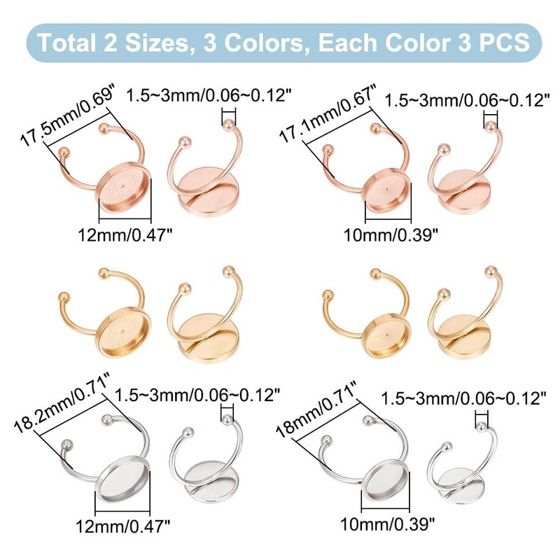 - Sizes: 304 stainless steel open cuff ring. Findings: approx. 17.1~18.2 mm inner diameter compartment: 10 12 mm 18 pieces; you can make finger rings of different sizes.