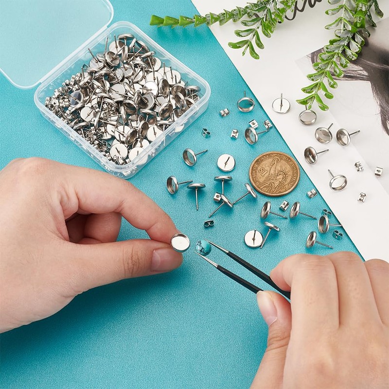 - Size: Flat Round 304 Stainless Steel Stud Earring Settings: 10mm in diameter, pin: 0.7mm, tray: 8mm, 100pcs;201 Stainless Steel Friction Ear Nuts: 5x3.5x2.5mm, hole: 1mm, 100pcs.