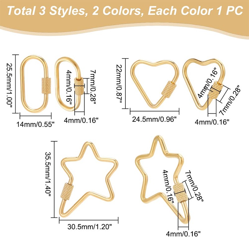 UNICRAFTALE 6pcs 3 Styles Screw Carabiner Lock Charms 2 Colors Stainless Stee...