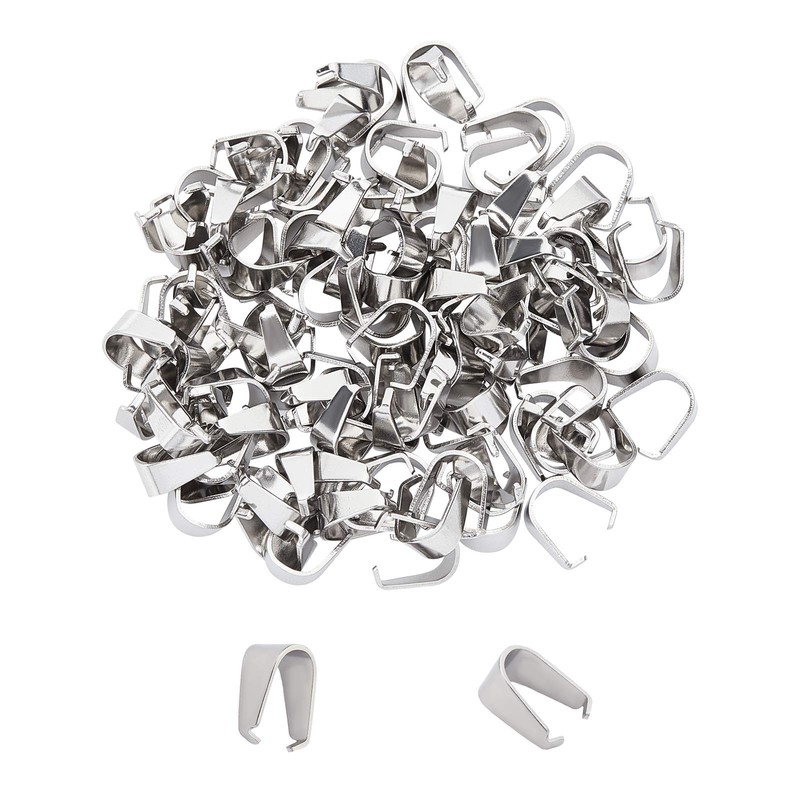 - Size & Contents: Bail: Width: 4mm, Length: 9mm, Thickness: 6mm, Pin: 0.6mm, Inner Diameter: 7x5mm; Pack of 100; Color: Stainless Steel; Material: 304 Stainless Steel; Stainless Steel Bail is used to secure beads or pendants