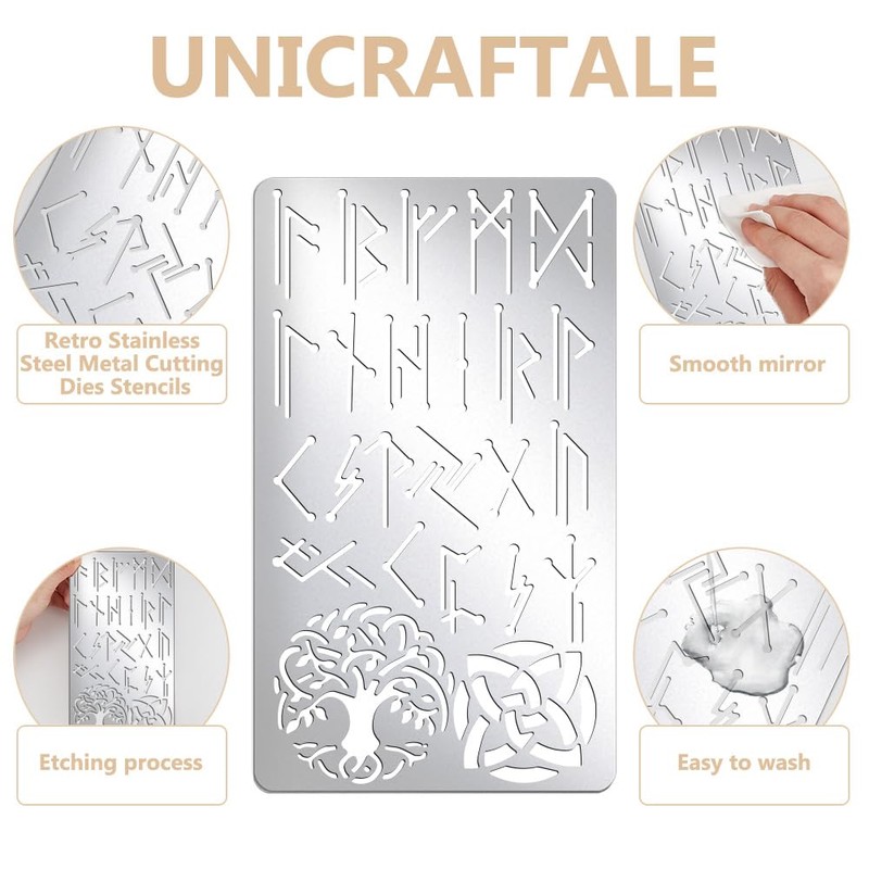 UNICRAFTALE Metal Stencils for Craft Wood Burning Viking Runes Stencil Stainless Steel Reusable Ancient Alphabet Template Wood Carving Letter Template for Painting Pyrography and Engraving Crafts