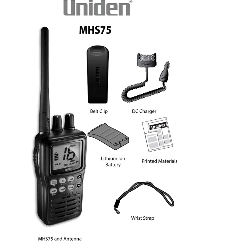 - JIS8 Waterproof Level - Uniden MHS75 VHF Hand Held Radio won't give up no matter how wet it gets. Whitecap splash, gusty spray, tidal wave, whatever, this radio can take it. The Uniden MHS75 2-way Marine Radio is built rugged to take the rigors of being out on the water, day in and day out with a full JIS8 waterproof rating. It also features a floating design, and is submersible for up to 30 minutes at five feet.
