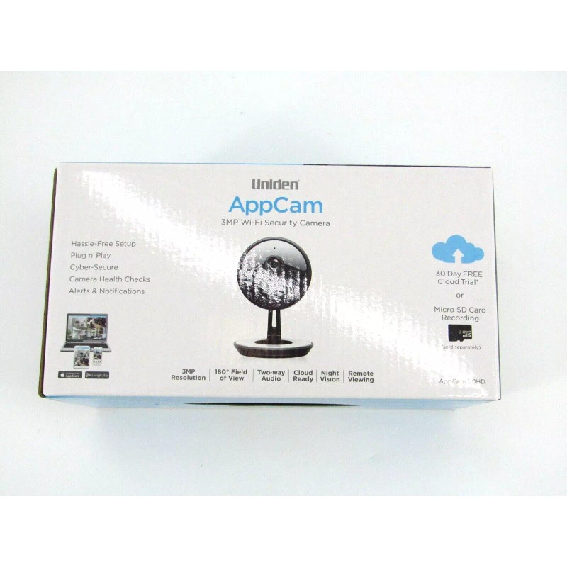 AppCam 50HD Cloud Security Camera is an indoor Wi-Fi cloud camera that gives you reliable, always-on video security. Easy-to-view video, easy setup and quality performance make this AppCam the right choice for homeowners who want added security. Protect your home with ease. The Uniden AppCam 50 HD cloud camera is the high tech solution for your indoor monitoring. With an Ultra-wide 180 degree field of view the camera covers a greater amount of area to keep an eye on things.
