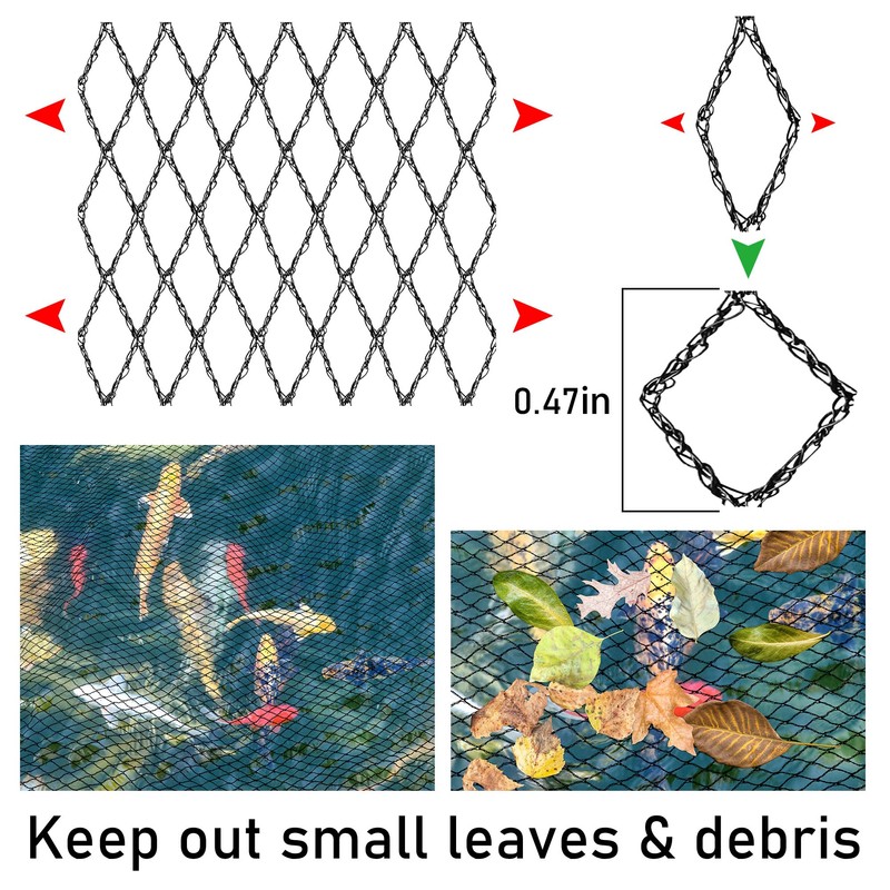 - 【Keep the water surface clean】: The mesh size of the fish pond netting cover is 1.2CM, which can effectively prevent most of the leaves from entering the fish pond, helping to maintain the clarity and purity of the water. At the same time, it reduces the frequency of cleaning the pond, saving you time and energy.