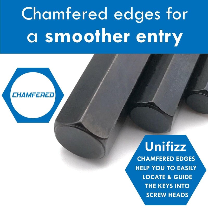 - 【Chamfered End】Each of the hex key wrench features chamfered edges on the short arm, these chamfered tips allow the keys to Insert smoothly into the fastener head, reducing wear on the wrench and fastener head.
