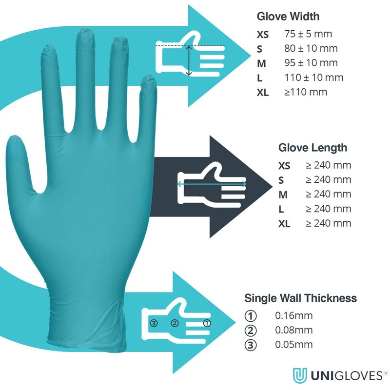 - Items delivered: 1 x box of 100 Unigloves Unitrile GS0054 examination gloves, food safe, powder free and latex free, AQL 1.5, size L, in blue