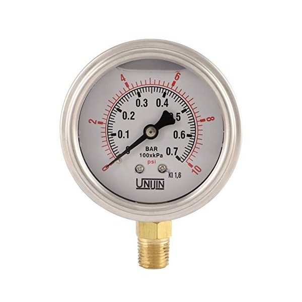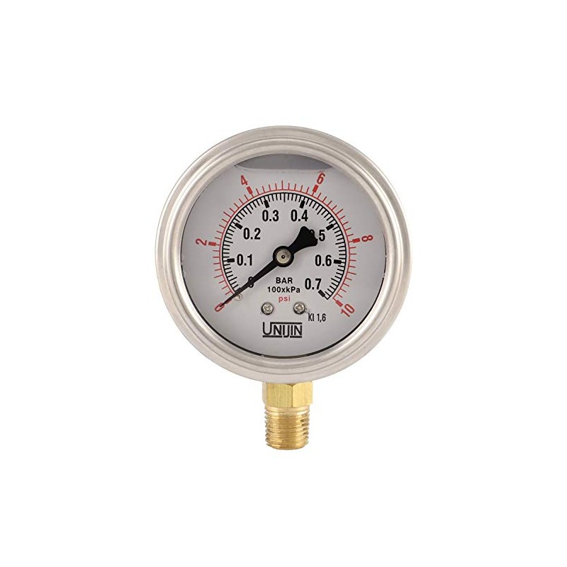 Unijin P251 Series 2.5" Dial, Oil Filled Pressure Gauge w/ Brass Internals, 0-10 PSI/kPa, ±1.6% Accuracy, 1/4" NPT, Bottom Mount