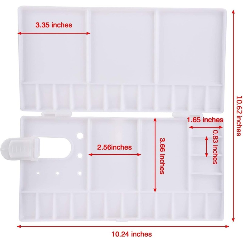 - Paint Pallet with Unique Design: Foldable paint pallet with multiple compartments for more convenience and practicability. Folded size (LWH): 26 x 13.5 x 2.1 cm/ 0.24 x 5.31 x 0.83 inches, unfolded size (LWH): 26 x 27 x 1.1 cm/ 10.24 x 10.62 x 0.41 inches; Note: the lid is not easy to be closed.