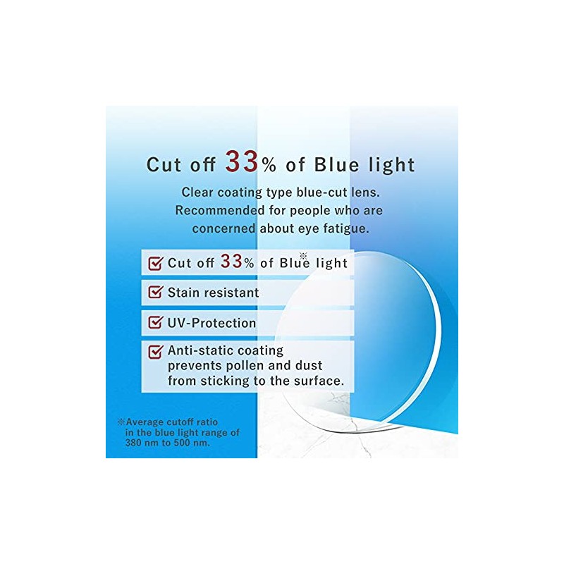 - 【レンズ機能】〇特殊コーティングによりブルーライトを約33%カット (青色光領域380nm〜500nmにおける平均カット率)〇UVカット〇ほこりや花粉をつきにくくする静電気防止コートを標準装備〇汚れに強いCSコートを標準装備