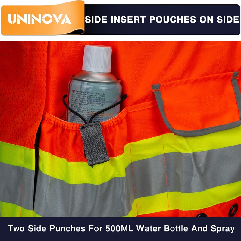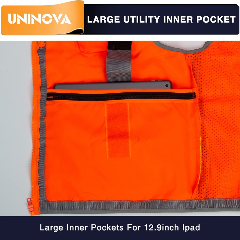 UNINOVA SV55 Surveyor Safety Vest is designed to protect people with the company value “Make the World Safer”. This orange safety vests use Class 2 approved orange mesh back fabric, solid oxford front fabric and reflective materials to ensure the quality with ANSI/ISEA 107-2015 Type R Class 2 standard. ANSI Type R Class 2 reflective apparel is necessary for workers exposed to traffic traveling over 25 mph and who work against complex backgrounds.The Design padded collar and mesh makes us feel comfortable, cooling and breathable, especially in hot summer.Numerous multi-functional pockets for various work items needed and have our hands free, great feature is the large back pocket for storing plans/paperwork/tablet iPad. 4 grommets and 2 durable mic tabs are super functional for our work as well.UNINOVA safety vest can be longer durability and cost effective by enhanced pockets,zippers, mic tab and grommets.
