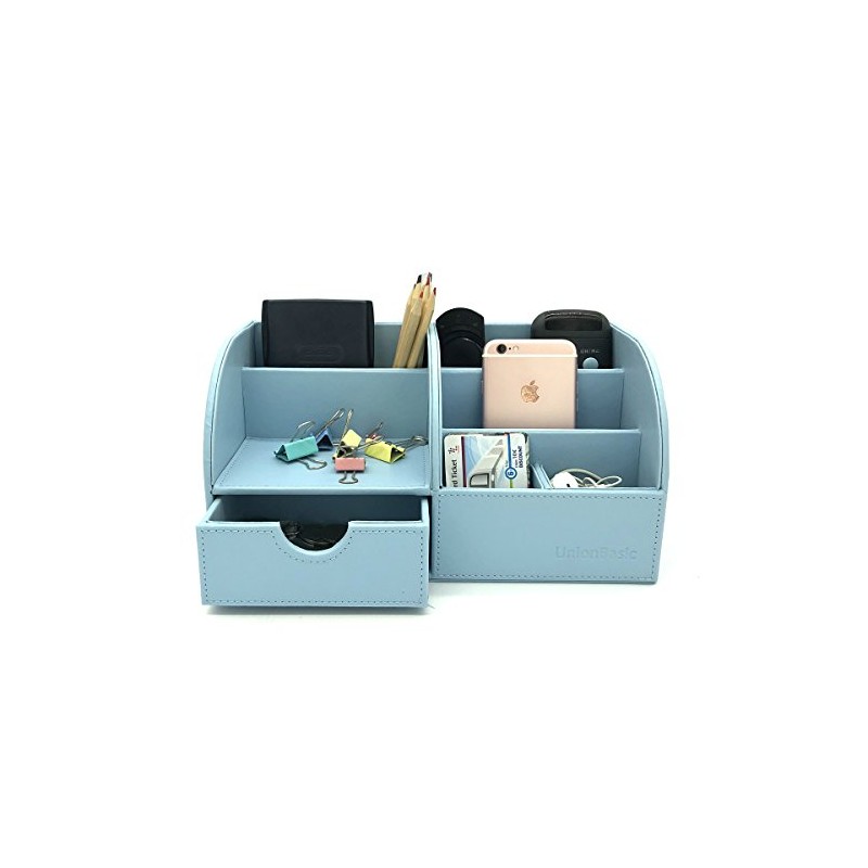 UnionBasic Office Desk Organizer - Multifunctional PU Leather Desktop Storage Box - Business Card/Pen/Pencil/Mobile Phone/Stationery Holder (Blue)