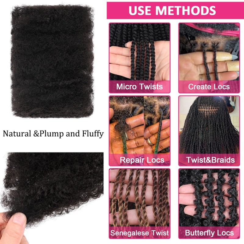 - Variable Hairstyle : You can make your own dreadlock extensions, repair locs with our afro kinky bulk human hair , afro kinky bulk human hair also can do micro locs, micro twist , butterfly locs, faux locs, passion twist crochet braids, senegalese twist crochet hair and so on, and make bodacious afro wigs