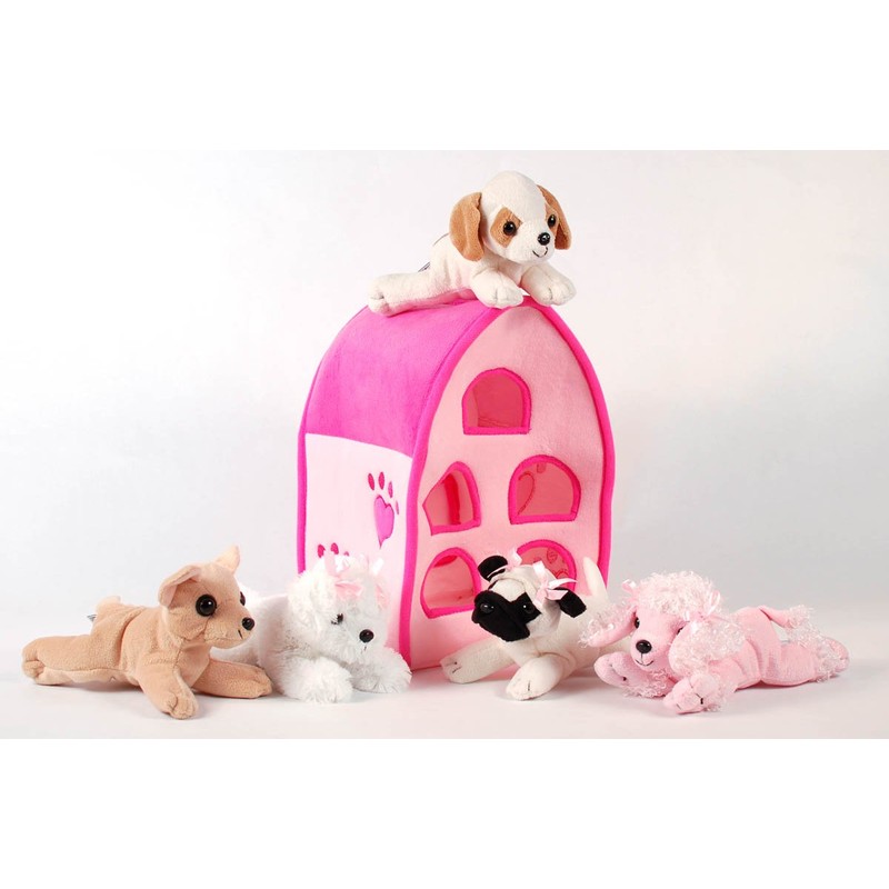 - includes a Pink Dog House with handle to store and carry the stuffed dogs