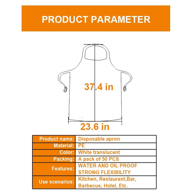 Disposable for quick cleanup and minimized washing expenses, great for cooking, eating, BBQ, restaurant, painting, cleaning, repairing, etc. daily use or other industrial uses. Effectively block stains and grease proof, keeps your clothing clean and dry.
