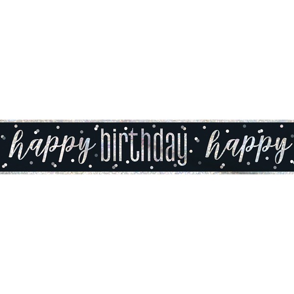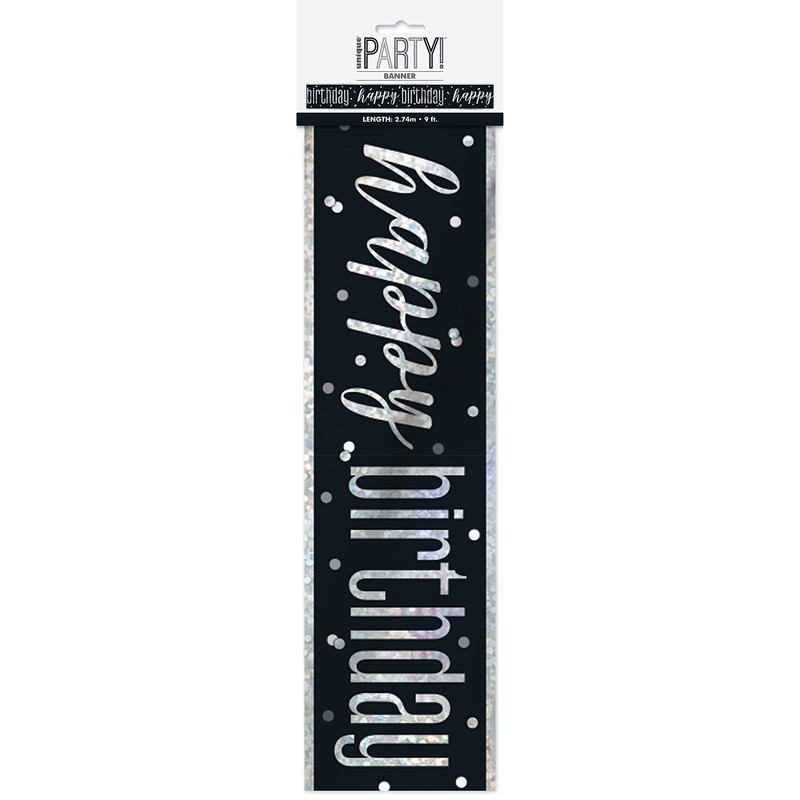 - PACKAGE INCLUDES: Black and Silver Foil "Happy Birthday" Banner. 1 Banner - 9 ft.