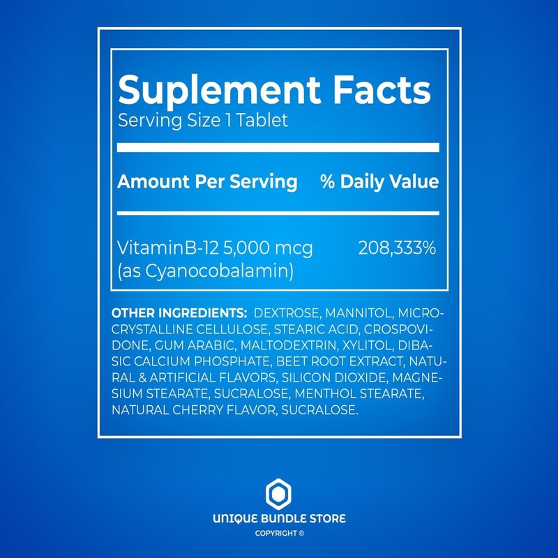 - Vitamin B12 5000 mcg: Extra strength formula with 5,000 mcg of methylcobalamin per tablet to support energy metabolism.