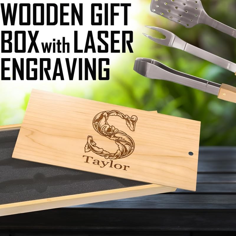 - Versatile and Practical: Ideal for backyard barbecues, family gatherings, or any grilling adventure, our BBQ Sets are not just gifts but a staple for any grilling enthusiast. The elegance of the engraved box paired with the utility of the tools inside makes this set a perfect blend of form and function, ensuring it's cherished and used for many years to come.