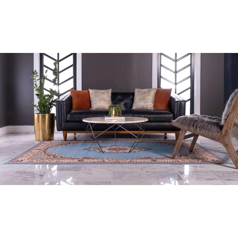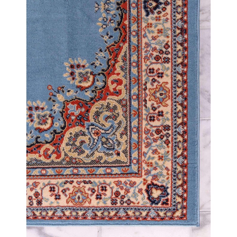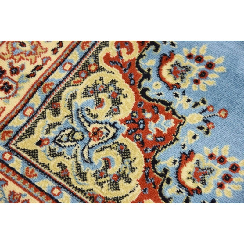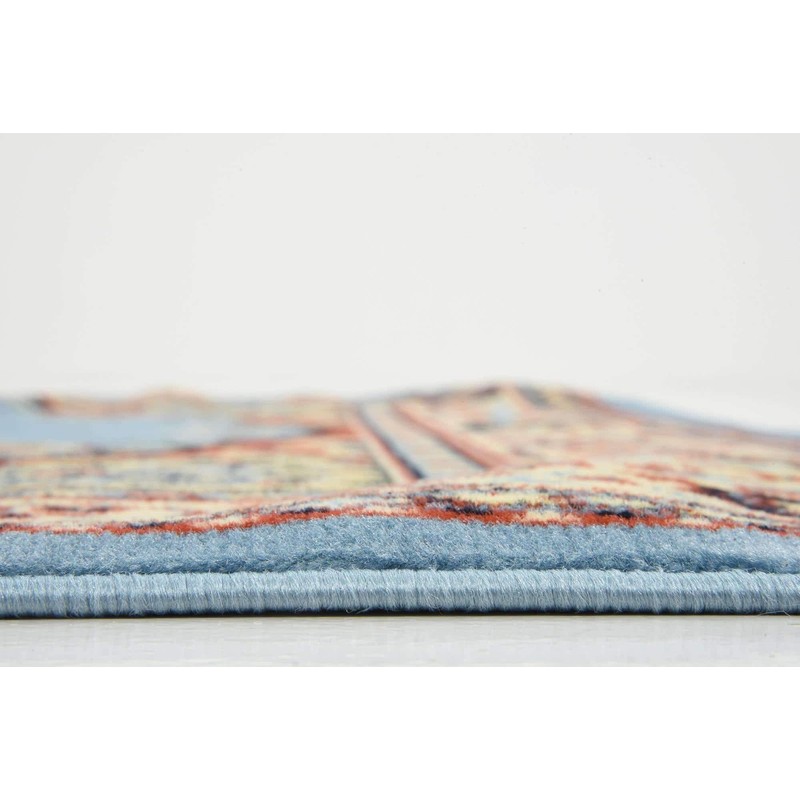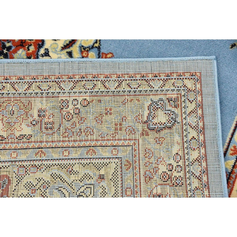 This Turkish Mashad rug is made of Polypropylene. This rug is easy-to-clean, stain resistant, and does not shed. Colors found in this rug include: Light Blue, Cream, Rust Red, Navy Blue, Gold. The primary color is Light Blue. This rug is 1/3" thick.