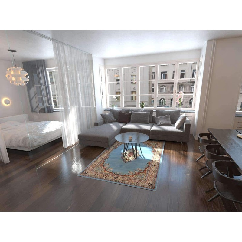 - Size in FT: 5' 0 x 8' 0 - Size in CM: 155x245 - Pile Height & Thickness: 1/3" - Colors: Light Blue, Ivory