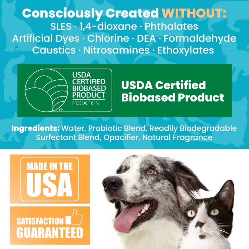 - Advanced probiotic blend completely eliminates stains and odors from all sizes and species of pets - No masking!