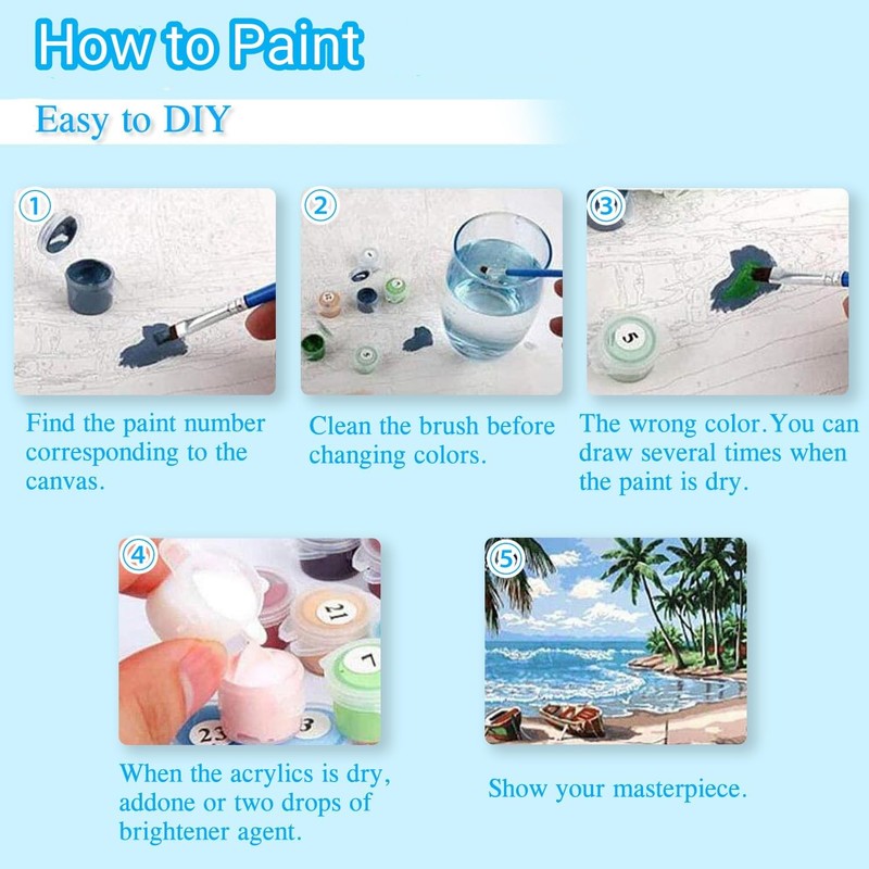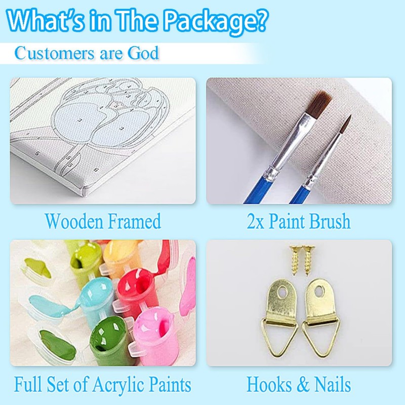 - What You Will Get The paint by numbers for adults includes all the tools you need for painting. 3 x canvas 20 x 30 cm (with frame), 2 x brushes in different sizes, 3 x hooks, 3 x matching screws, 1 x set of high-quality colours and 1 instructions (English language not guaranteed). It can be used as a gift for family or friends on Father's Day, Mother's Day, birthday, Christmas and other important holidays