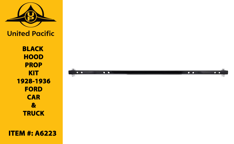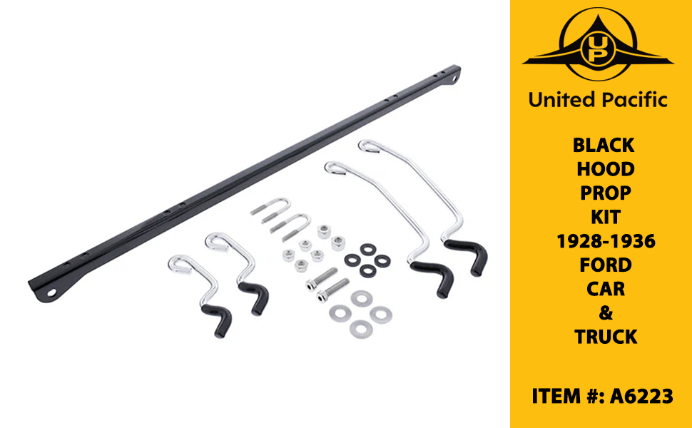 - FEATURES: The United Pacific Black Hood Prop Kit for 1928-1934 Ford Car/Truck features a kit that includes two pairs of support arms in different length with a beautiful black finish for looks and durability. These UP prop kits are designed for hoods that open on the side and eliminates resting the hood on the cowl and prevents cracking your expensive car paint. For installation convenience, all mounting hardware is included.