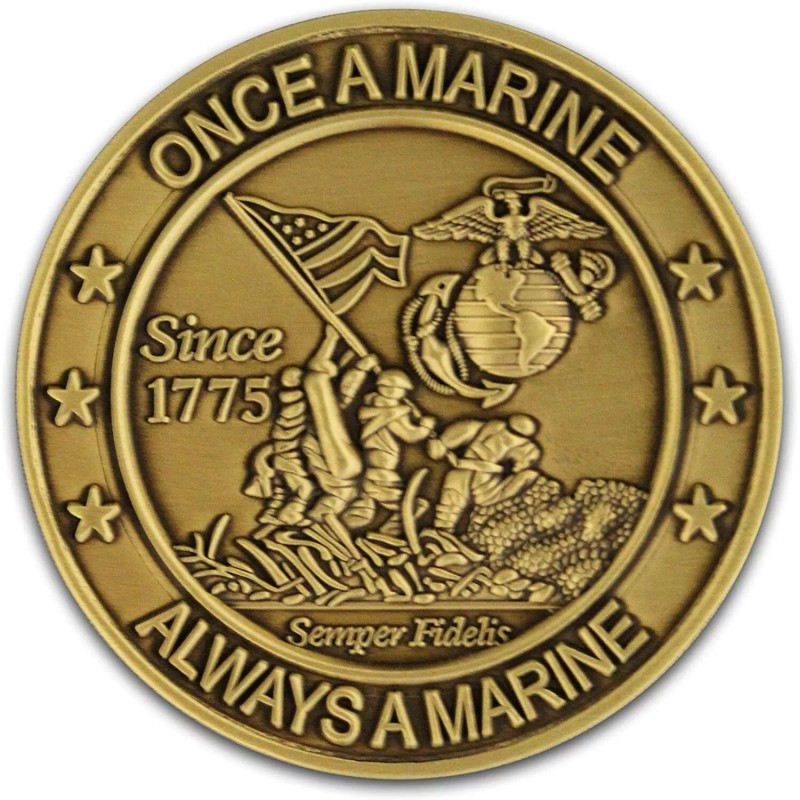 The reverse side showcases a rendering of the Iwo Jima Memorial next to an Eagle, Globe, and Anchor, and text "Since 1775 Semper Fidelis" all within an outer ring that houses the phrase, "Once a Marine Always a Marine."