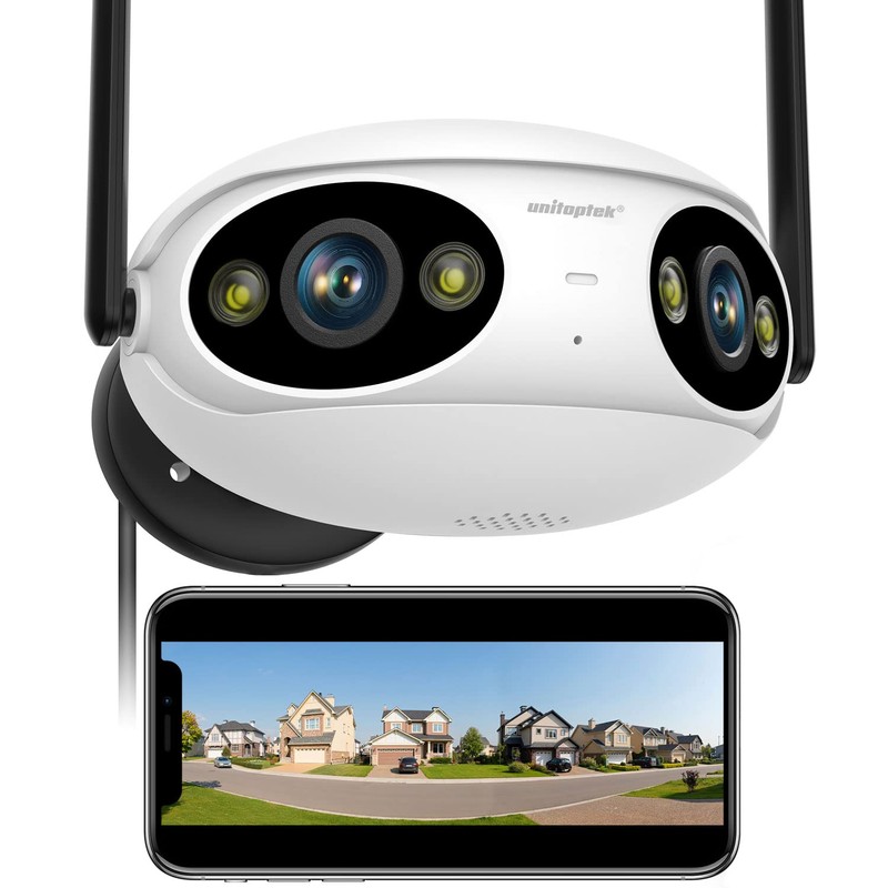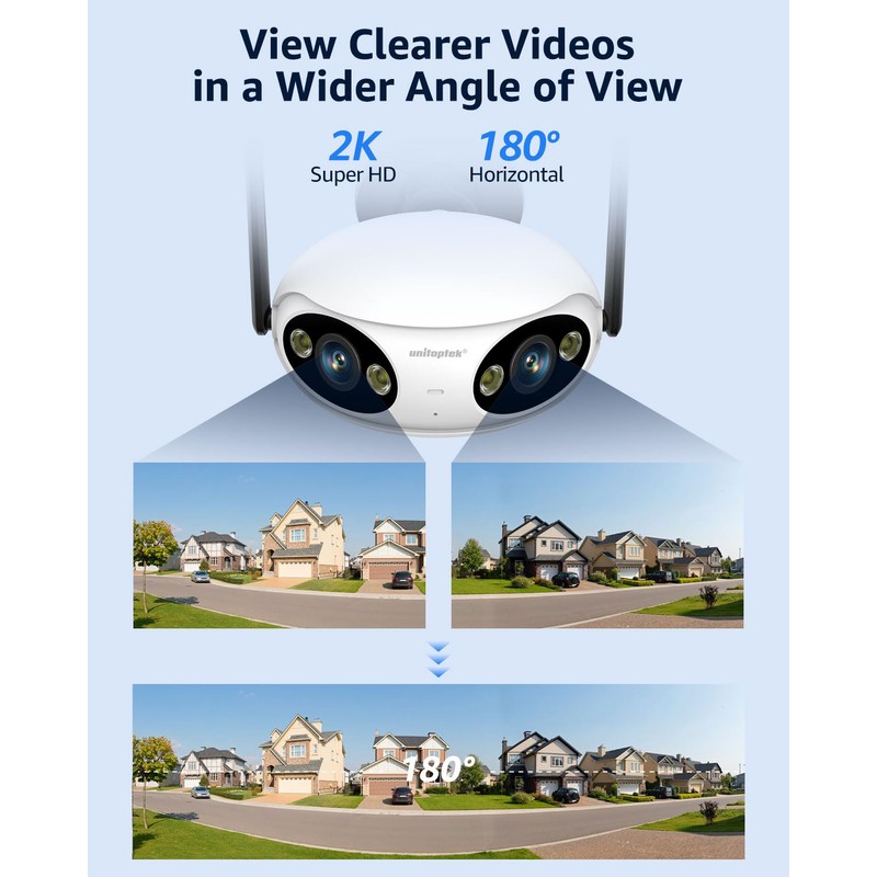 Unitoptek 2K Outdoor Security Camera, Wireless WiFi IP Cameras for Home Security, Dual-Lens 180° Ultra Wide Angle, Smart Human Detection, Color Night Vision, 2-Way Audio, IP66