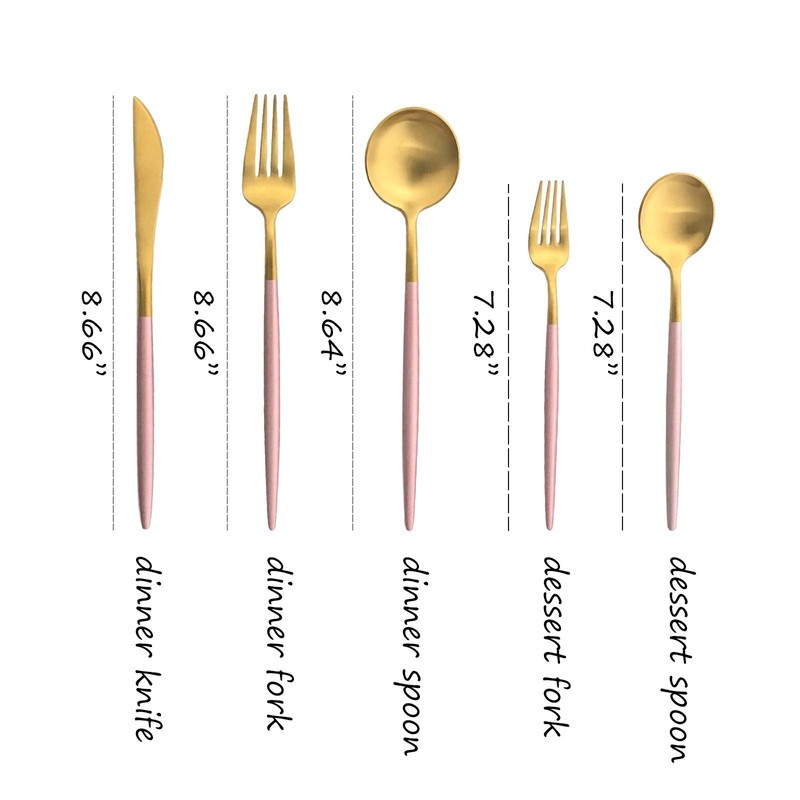 **About Products services** If you have any problems with your purchase, please email us and we will respond in a timely manner After receiving the items, if you have any problem contact us and we will solve the issue to your satisfaction **About Size** Steak Knife Dimensions: Length: 23cm / 9.06 inch Dinner Spoon Dimensions: Length: 19.5cm / 7.68 inch Dinner Fork Dimensions: Length: 19.5cm / 7.68 inch Dessert Fork Dimensions: Length: 18cm / 7.09 inch Dessert Spoon Dimensions: Length: 18cm / 7.09 inch **About cleaning** Use neutral detergent to flush it, Pls never use strong alkaline or strong oxidizing chemicals wash them.After cleaning your flatware, Please make it dry and keep the tableware clean and dry.