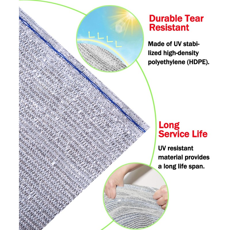 - Material: Made from HDPE fabric. The tarp is lightweight and durable, great reflective shade for protecting from frost or heat, reflects out unwanted heat, radiation, and light providing a cooler environment beneath. It brings 90%-95% the shadow, 5%-10% of the sunshine can through it.