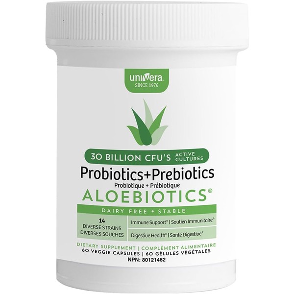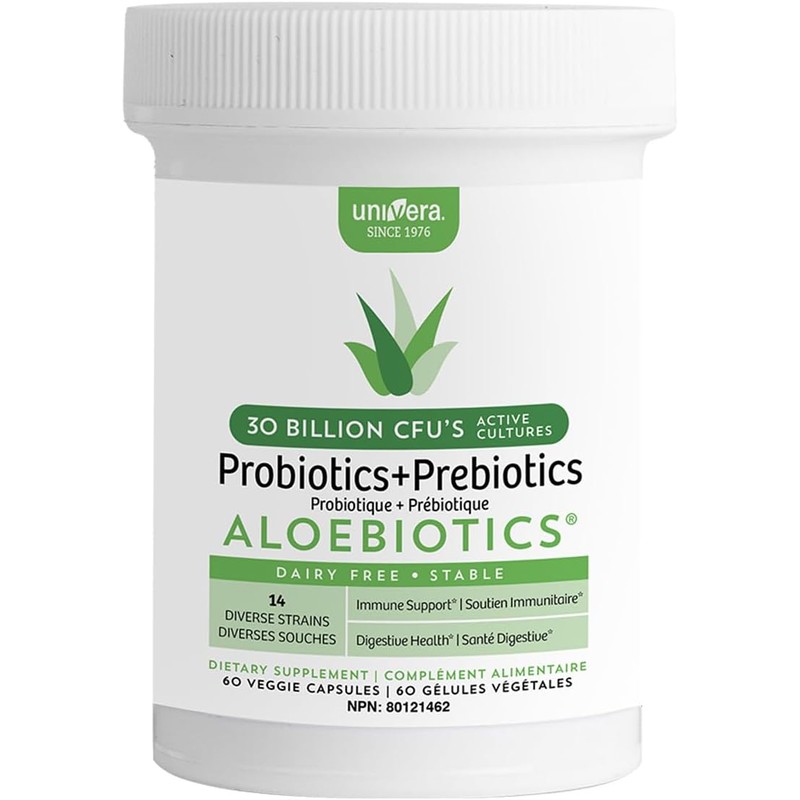 Univera Aloebiotics, Probiotics and Prebiotics 30 Billion CFUs -14 Strains, Digestive Enzymes for Adults - Probiotics Lactobacillus Acidophilus - Digestive Health, Vegan 60 capsules