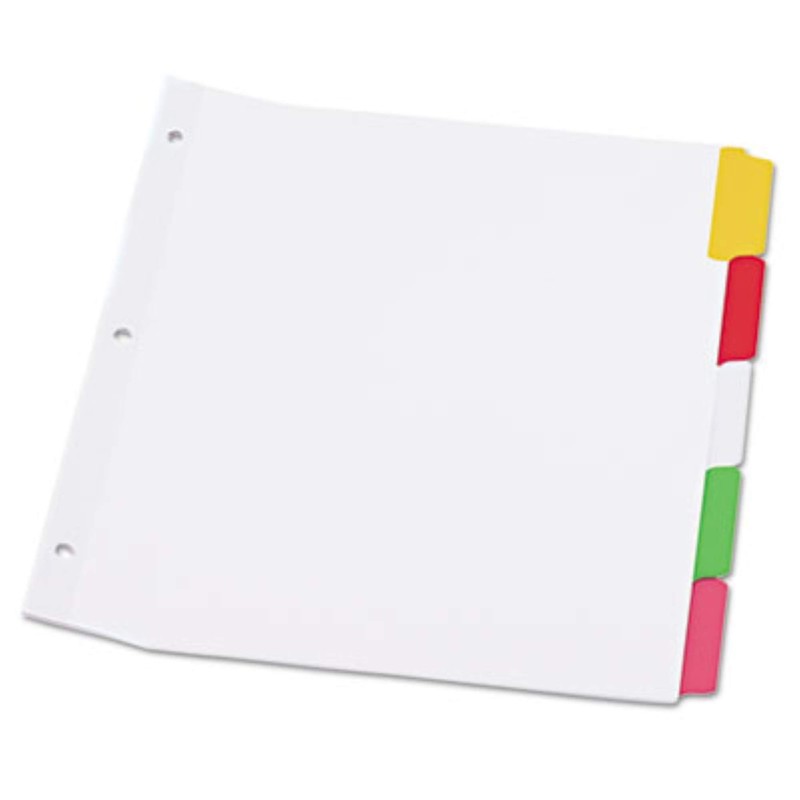 Write directly on coated tabs with nonpermanent ink and erase with standard eraser to reuse again and again. Holes for binder rings are reinforced with clear plastic to prevent tearing. Three-hole punched for use in standard ring binders. Tab Style: 1/5-Tab; Tab Color(s): Multicolor; Index Divider Size: 11 x 8 1/2; Form Quantity: 1.
