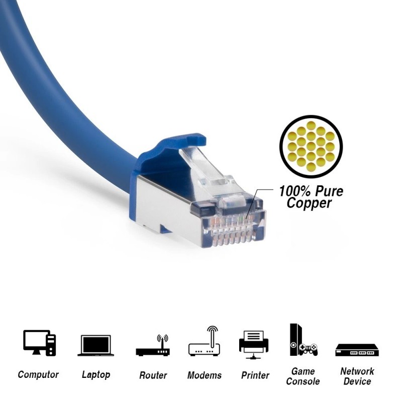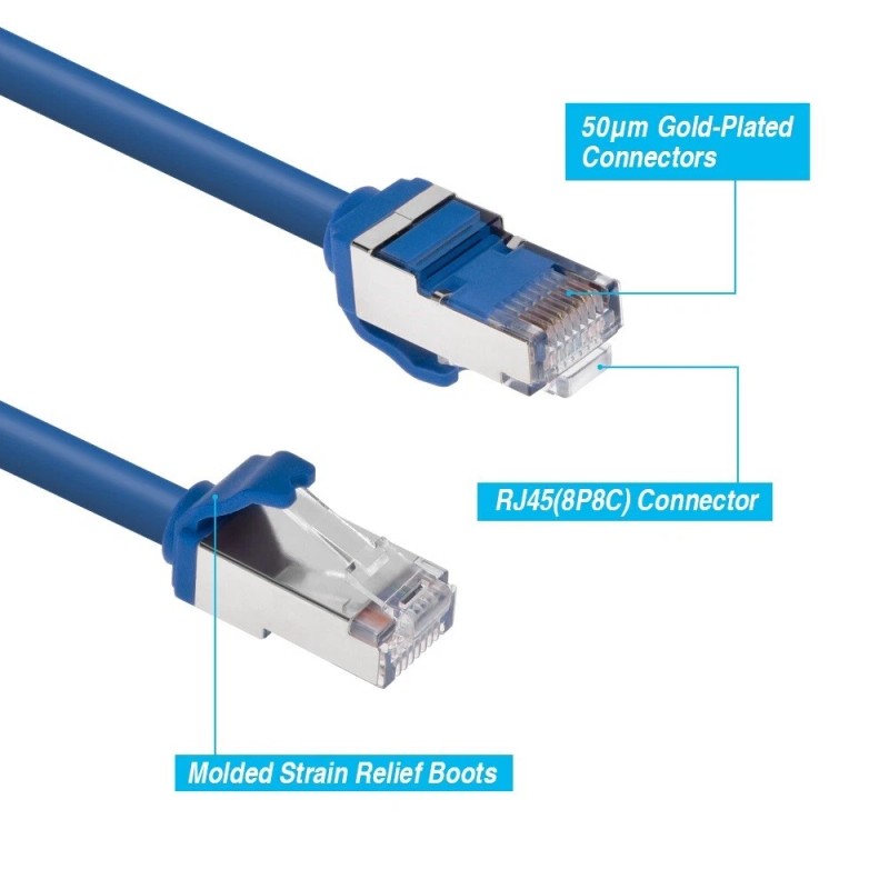 The 5 Feet 28AWG Category 8 S/FTP Ethernet Cable in Blue is designed to deliver exceptional performance with up to 40Gbps transfer speeds and a bandwidth of up to 2GHz.