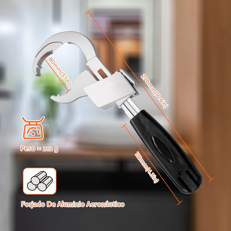 - đ§ăPremium MaterialăThe wrench is made of aviation grade aluminum alloy with high toughness, impact resistance and durability. The adjustable wrench comes with 3 replacement heads, making it suitable for special shapes of sinks and fittings.