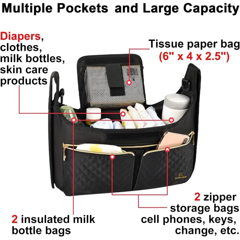 · ❤️Large Capacity Diaper Bag The internal of stroller caddy size is 14*5*7 IN, only 0.9 lbs., with 7 main pockets, tissue mesh pocket + 2 front pockets + two large, insulated cup holders + large middle pocket + built-in zipper pocket. Pack your toys, coffee, bottles, keys, phone, snacks, diapers and clothes.