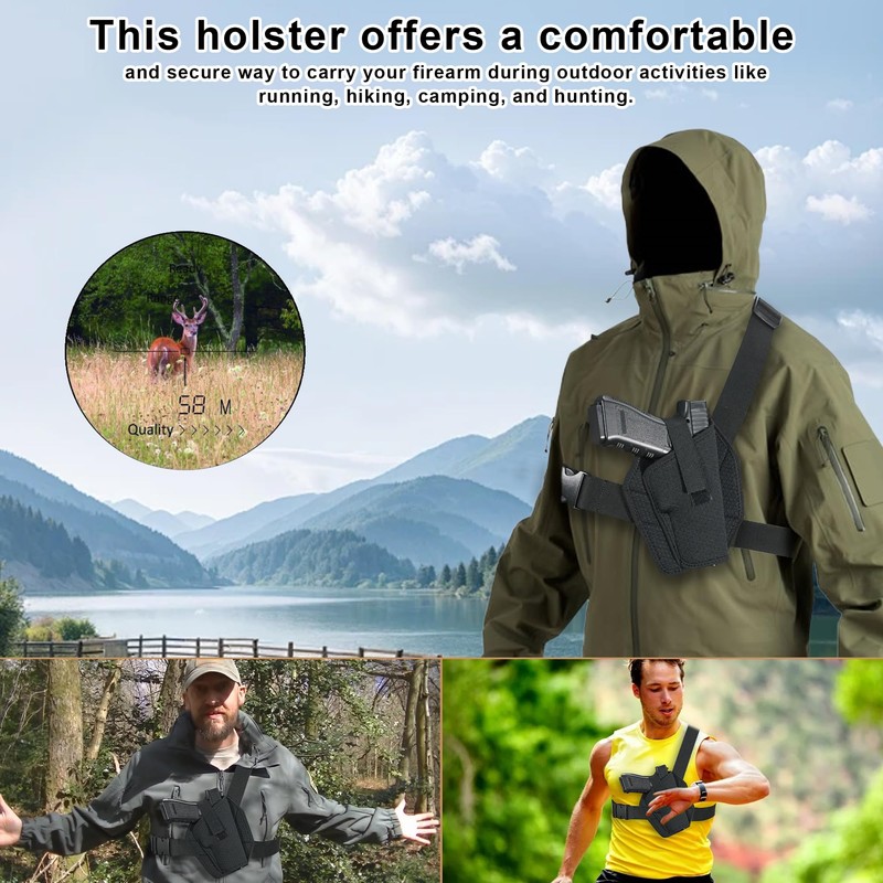 - Versatile Carry Option: This chest holster is designed for both men and women, offering a comfortable and secure way to carry your firearm during outdoor activities like running, hiking, camping, and hunting.