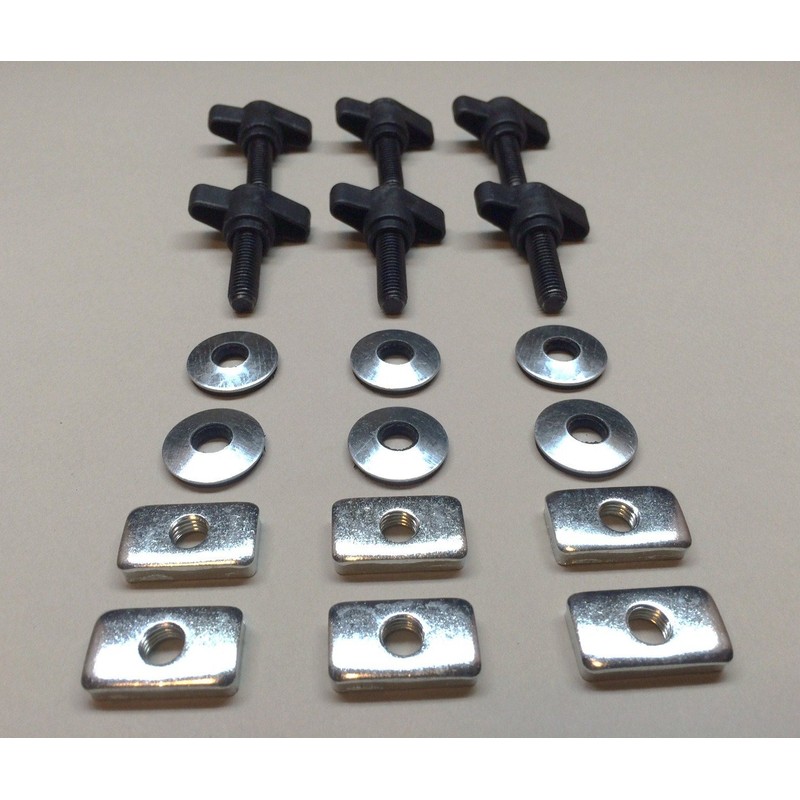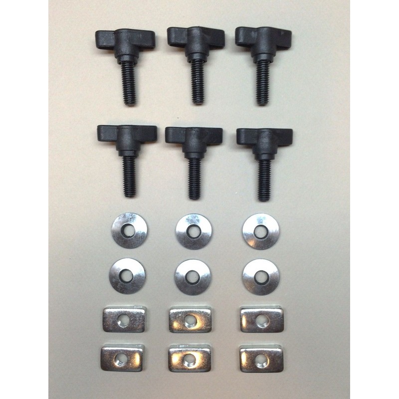 - Includes: Set of 6 Fasteners, Thumb Screws, Rubber Backed Washers and Nut Plates.