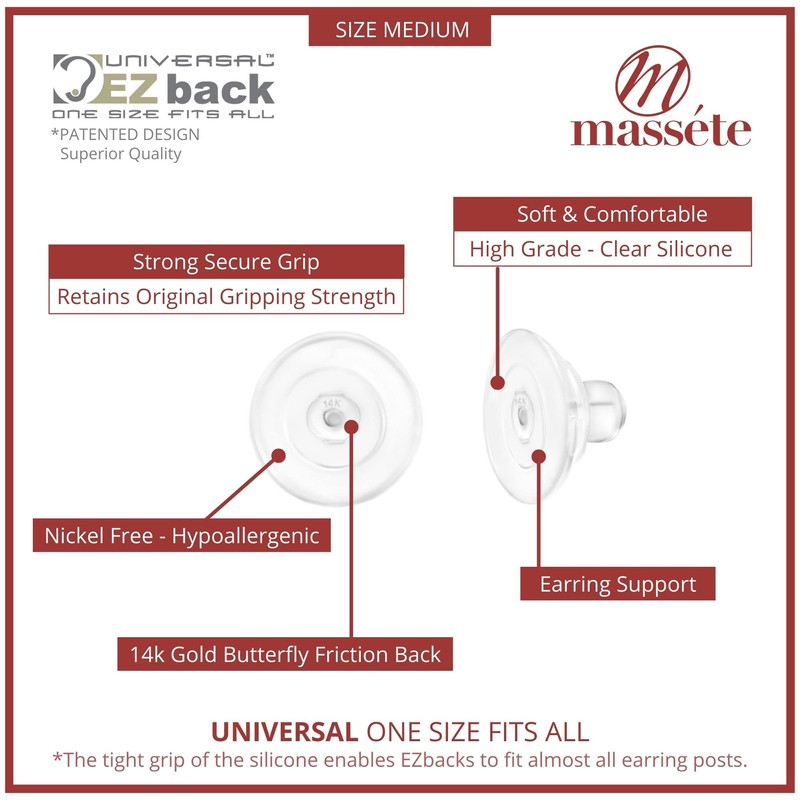UNIVERSAL EZback earring backs are made of soft and clear high grade allergy free silicone with a solid [not plated] 14k White Gold butterfly friction clutch inside.